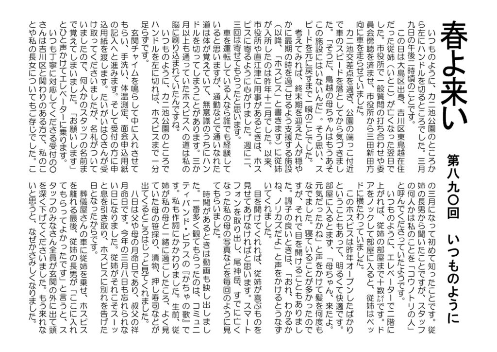 活動レポート2243号、「春よ来い」シリーズの第890回「いつのもように」をホームページにアップしました。下線部をクリックしてご覧ください。