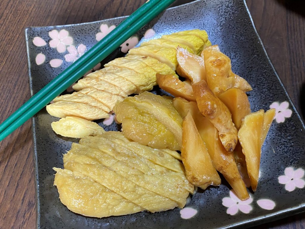昨日は従姉の家やお世話になった人の家に悔やみに行ったほか、友人の家にお茶飲みにも出かけました。ここのお連れ合いは漬物が上手で、私の食の好みもよくご存じです。昨日は私が大好きなカライモ、ハヤトウリなどの漬物を出してくださいました。下の画像がそれです。美味しそうでしょう。友人のところは久しぶりだったこともあって、たくさんの世間話をしました。