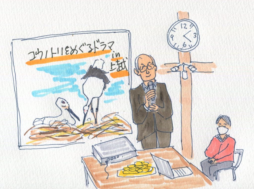 午後からは、ほくほく線うらがわら駅で「駅舎でカフェ・イベント」と題するイベント(主催はNPO「夢あふれるまち浦川原」)がありました。ここで、私は最近のコウノトリをめぐる数々のドラマを動画などで紹介しました。吉川区での巣の再建、電力さんのおかげでかさ上げしてもらったが、ピカピカの電柱に果たして巣ができるか、冬も巣材があるかなど心配がいくつもあった、そのおかげで親鳥ペアが戻ってきて巣づくりをしたまごをあたためている姿に感動したことを語りました。三和区では、昨年のペアのメスがいなくなり、オスだけで巣を守っていたが、新しいパートナーを迎えたこと、別のペアがやってきて巣の争奪戦が始まったなど、みなさん、興味深く聴いてくださいました。冒頭、藤田会長の挨拶に続いて、「東頸城の歌」を全員合唱しました。イベントでは、地元の音楽グループやのど自慢などで活躍している歌い手さんも登場しました。下は全員合唱の風景と私の報告風景です。