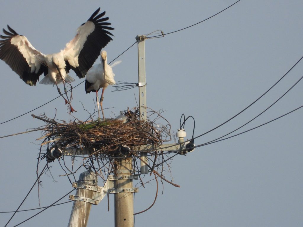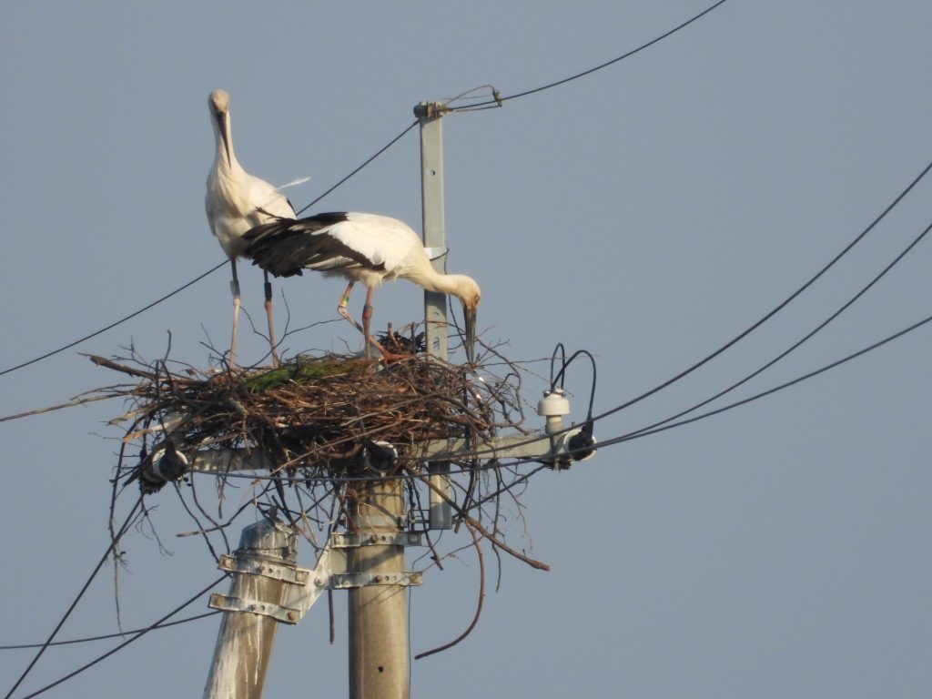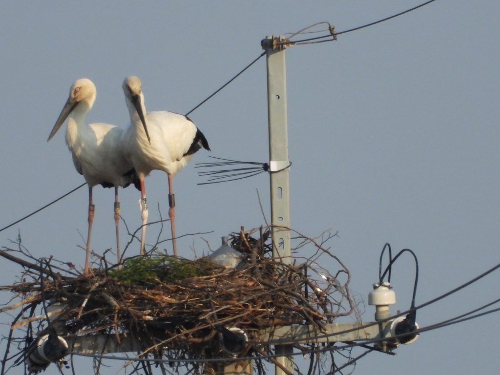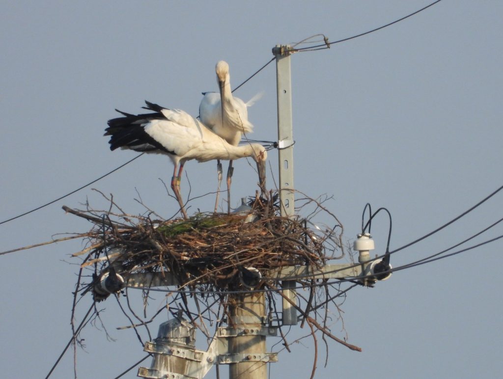 おはようございます。今朝は4時に起床し、イラストの色塗りをしました。その後、5時40分過ぎに高士区へ向かいました。じつは昨夜、高士区の住民から電話があり、区内の電柱にコウノトリが巣を作っていると連絡がありました。急いで行ったのですが、何せ夜です。電柱だけ確認しました。それで今朝早く、もう一度行ったというわけです。