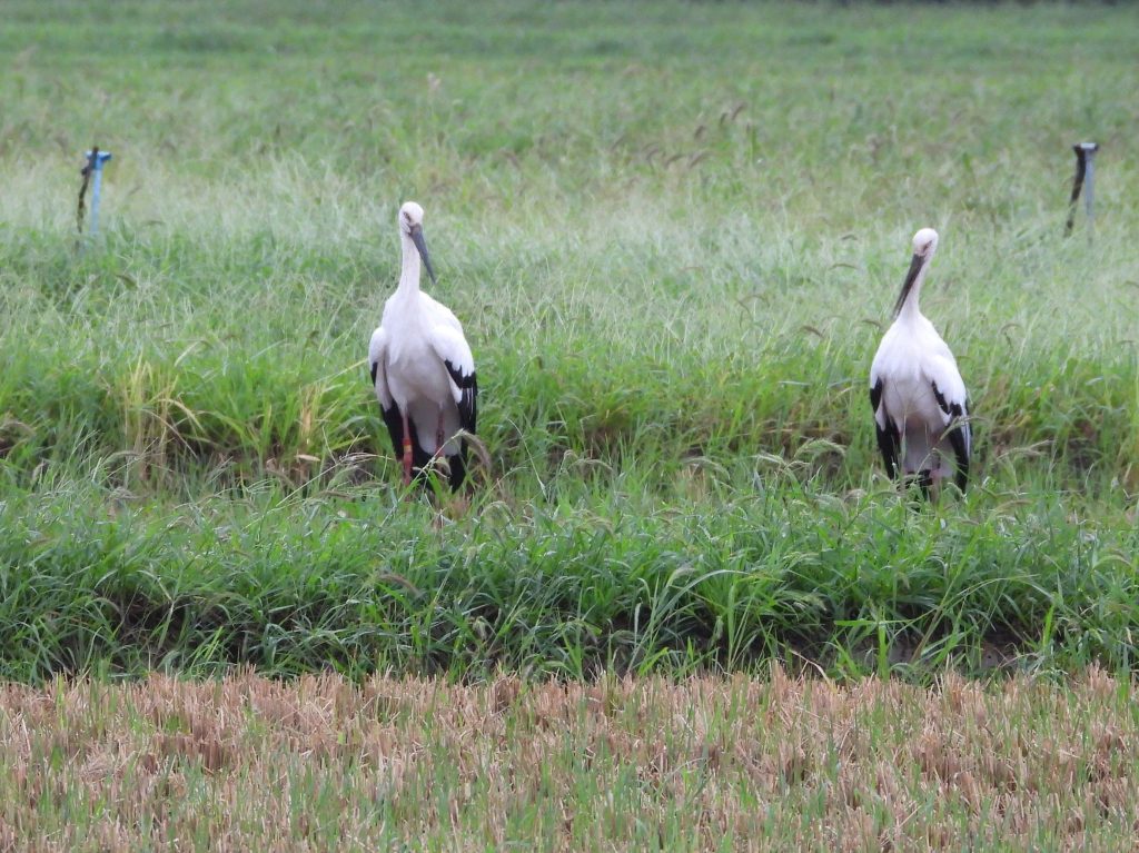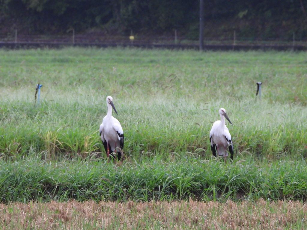 今朝もコウノトリのペアが事務所近くの田んぼに来ています。これで5日目かな。雨が降っているので、時々、羽を広げて雨を落としていました。