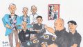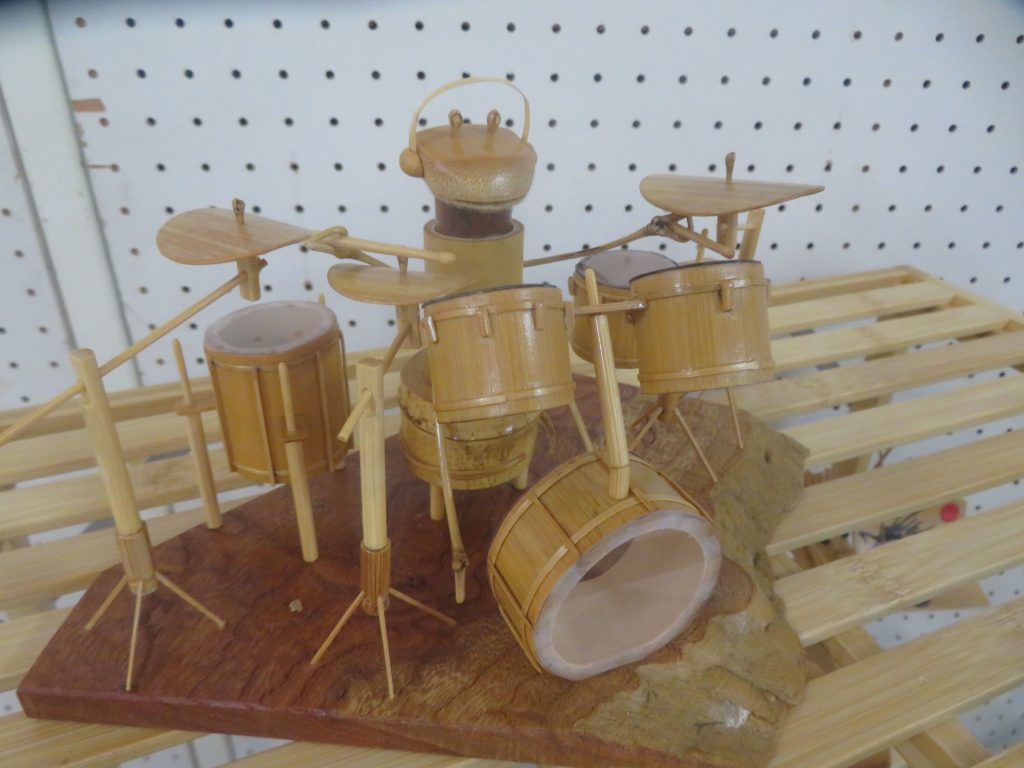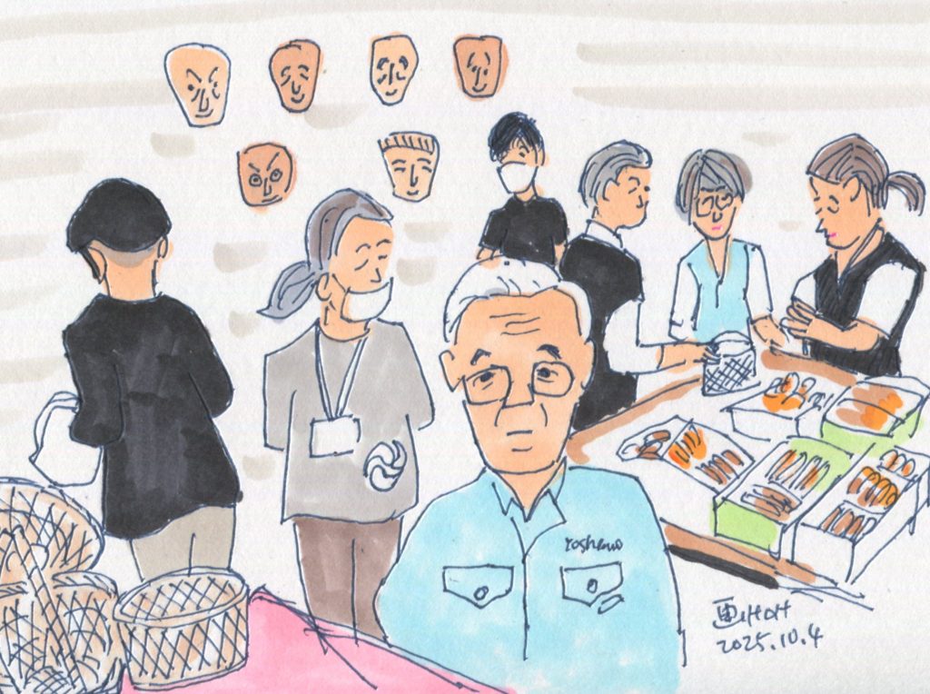 作品展は柿崎区を中心に市内各地から素敵な竹細工、パッチワークなどが展示、販売されていました。すごいなと思ったのは小竿さんのドラマ演奏風景を表現した竹細工です。最高作品です。ギターやケーナ、フルートなども並んでいました。下のイラストは吉川区の竹細工の出展者、岩井さんとその周辺の人たちを描きました。小竿さんの作品は写真です。