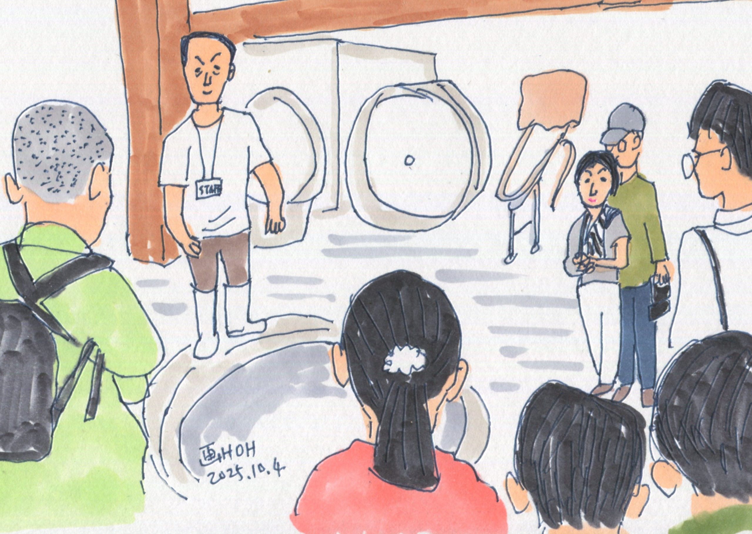 蔵まつりに参加したのは初めてです。丁度いいタイミングで蔵の中を案内するグループに入ることができました。スタッフの方の説明がコメ作りから酒造りまでわかりやすく解説してくださいました。社長さんや蔵人のみなさんの造りへのこだわりがしっかりと伝わってきました。建物は木造の「これぞ蔵」という感じでした。中越沖地震や能登半島地震での被害状況もお聴きしました。トップのイラストは工場見学を描いたものです。