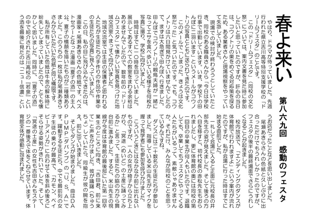 活動レポート2222号、「春よ来い」シリーズの第869回、「感動のフェスタ」をホームページに掲載しました。ご笑覧ください。