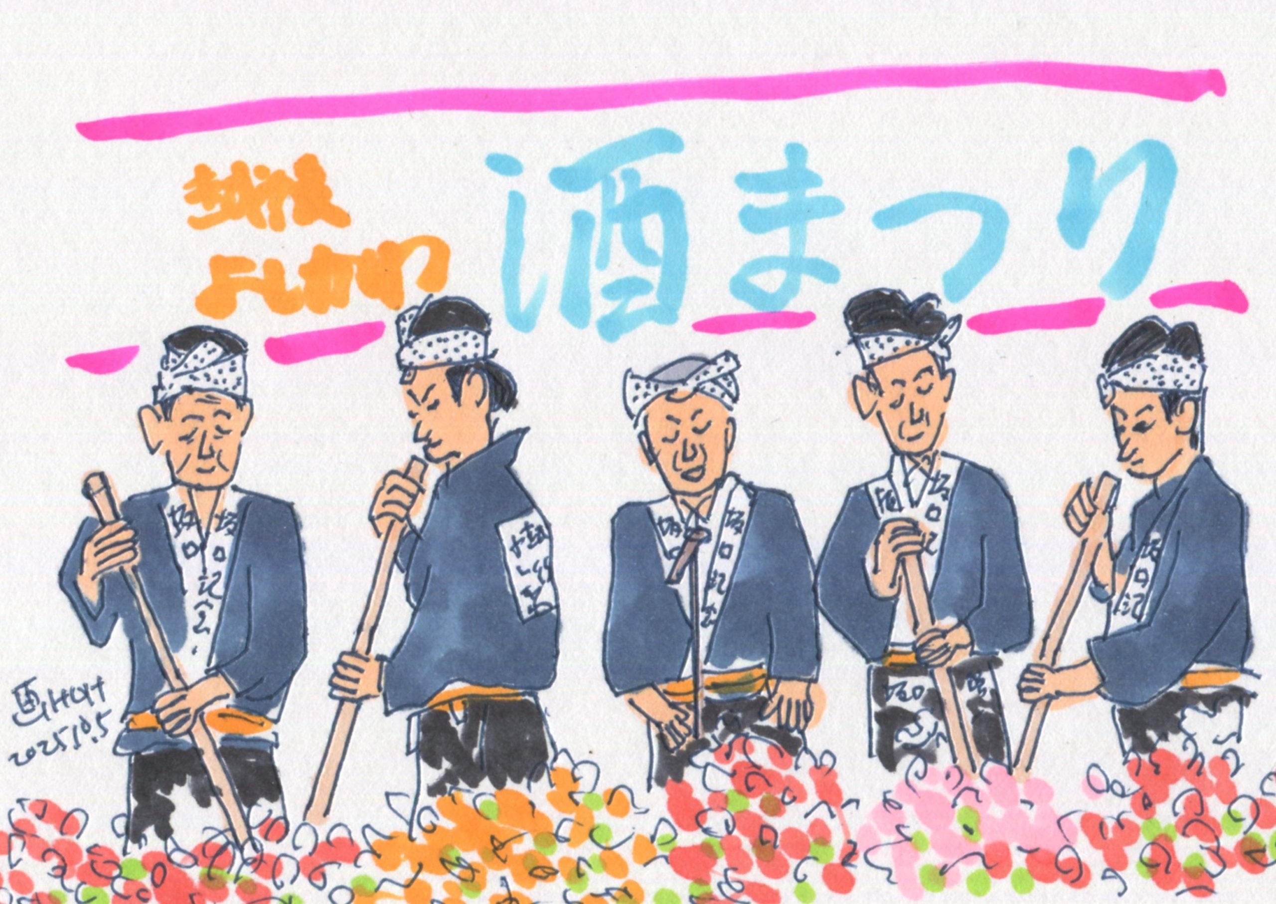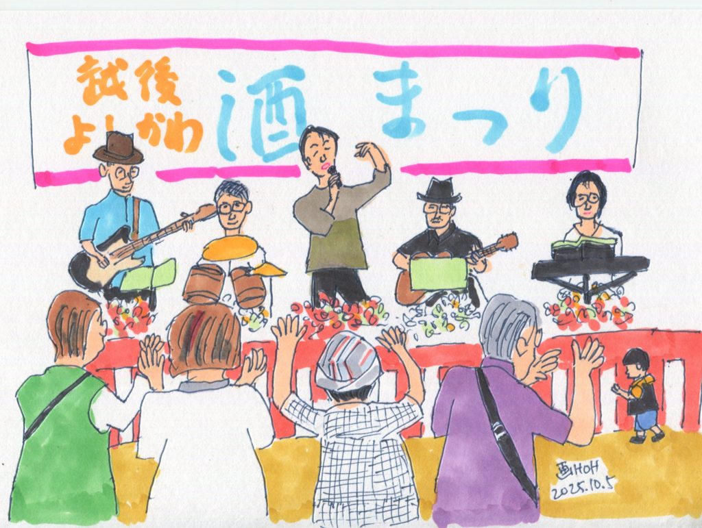 昨日は第28回目の越後よしかわ酒まつりでした。会場となった杜氏の郷の駐車場でなく、草がある広場にはいくつものお店のテントが立ちました。開始は10時から。スタート時はパラパラだったお客さんは徐々に増え、品和亭さんのから揚げのテントなどいくつかのテントでは長い行列ができました。開会式には今回も東京都荒川区の副区長さん、議長さんなどが駆けつけてくださいました。酒まつりと言えば、試飲会と酒造り唄が思い出されますが、午前の舞台では吉川中学校吹奏楽部の演奏、酒造り唄が披露されました。私の父親と酒造りで一緒に働いたという89歳の柳沢久さんが元気に唄ってくださったのは感激でした。トップのイラストがその時の様子です。