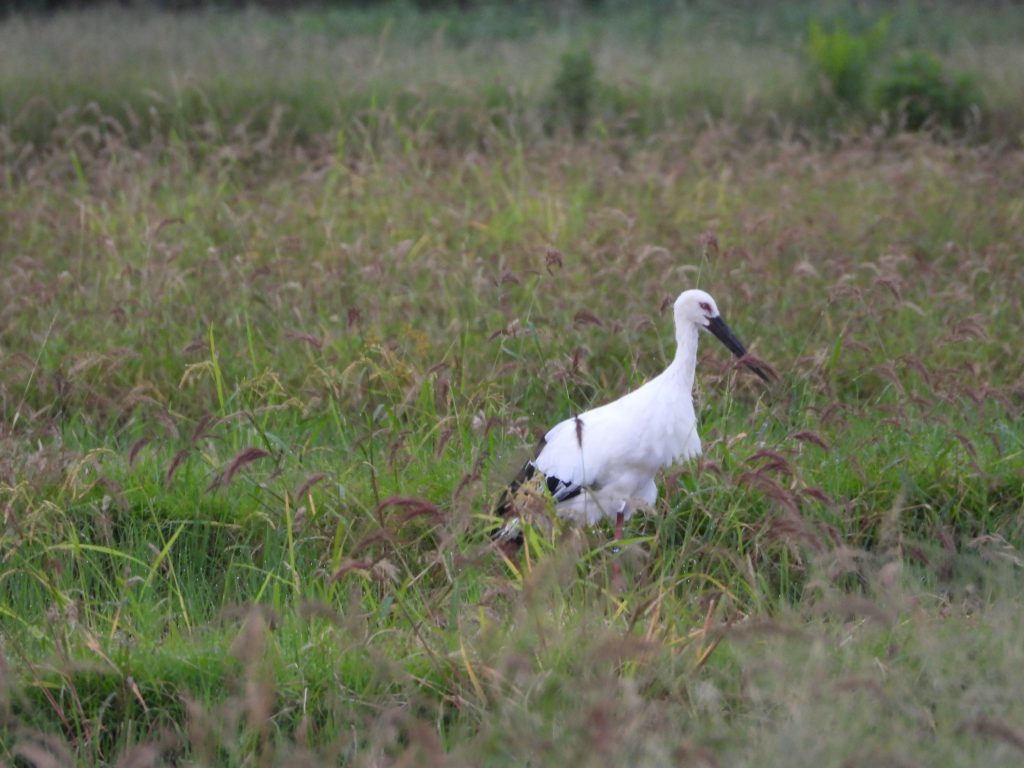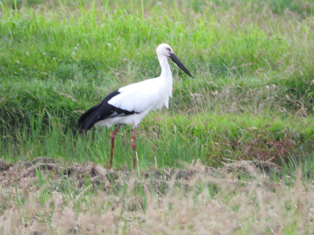朝、コウノトリの観察に出ました。親鳥ペアは下町の田んぼにいました。ただ、近くではありますが、それぞれ別の田んぼで盛んに何かを突いていました。何か虫がいるのだと思います。一度、この食べているものを確かめたいですね。下の画像は上がオス、下がメスです。動画はこちらから。