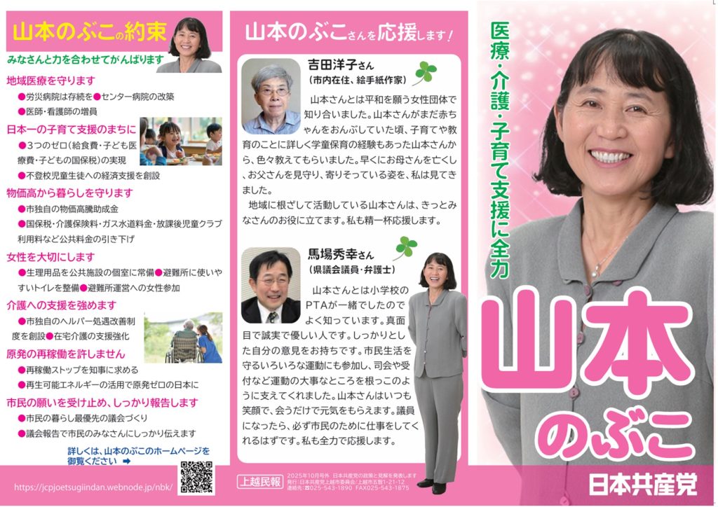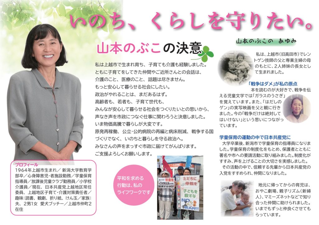 昨日は午前から党務で直江津にてデスクワークをしました。市議補選を前にやるべきことが山盛りです。一つひとつ、みんなで手分けしてやるしかないと思っています。昨日アップしたリーフレットは第一弾で、バージョンアップすることになりました。下がその画像です。
