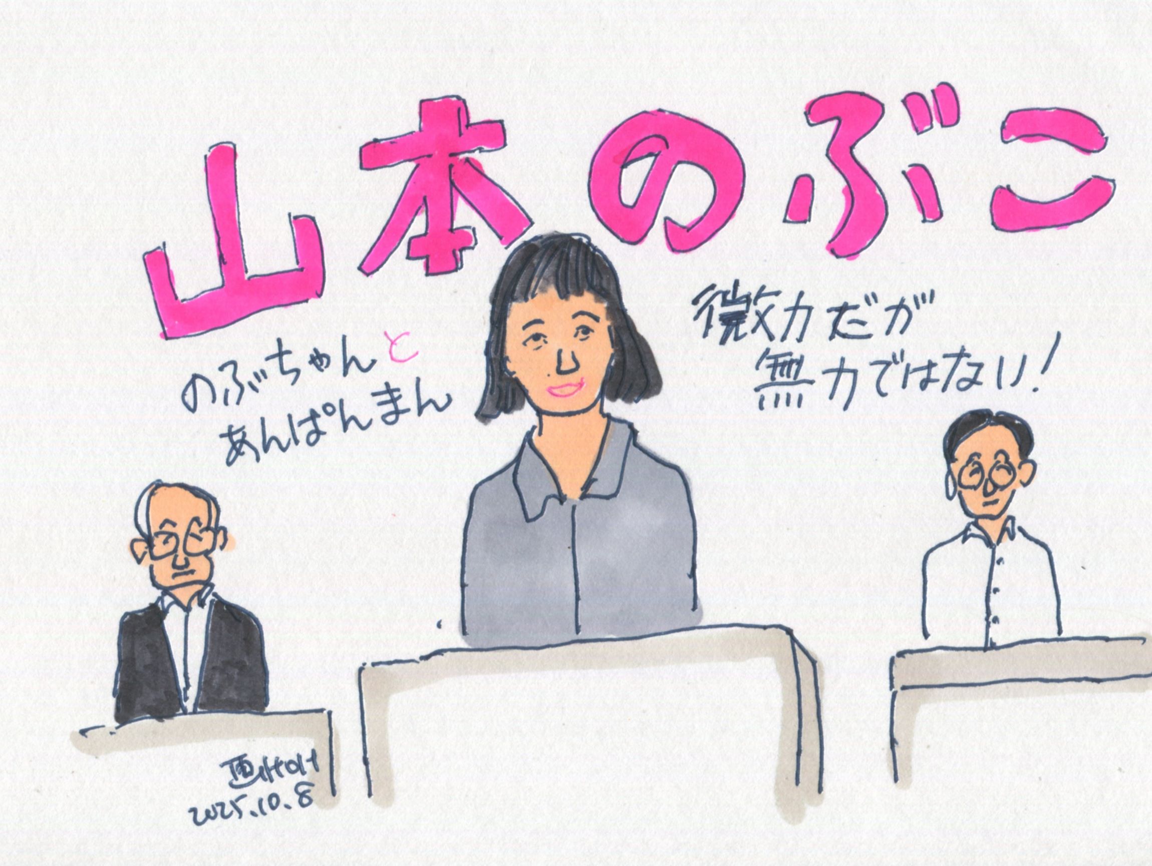上越市議補選で頑張る決意をした山本のぶこさんを激励する緊急のつどいが昨夜、行われました。馬場県議など数人が、「よく決意してくれた。やさしさとしんの強さが魅力」「医療再編強行と柏崎刈羽原発再稼働に待ったをかける力に」「暮らしを守る力になってほしい。全力で支援する」「〝のぶちゃんとアンパンマン〟で頑張ろう」などと激励しました。のぶこさんの座右の銘は、〝微力だが無力ではない〟とのこと、大いに盛り上がったつどいでした。トップ画像はその時のことを思い出して描いたものです。