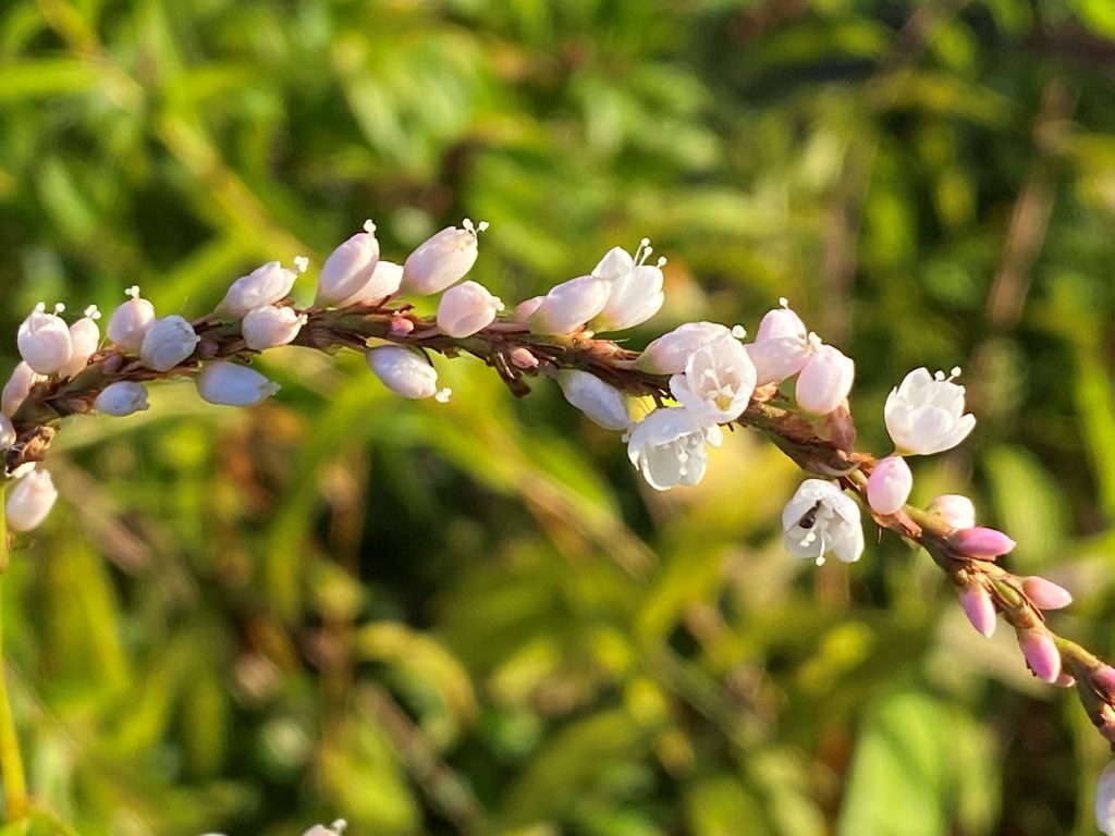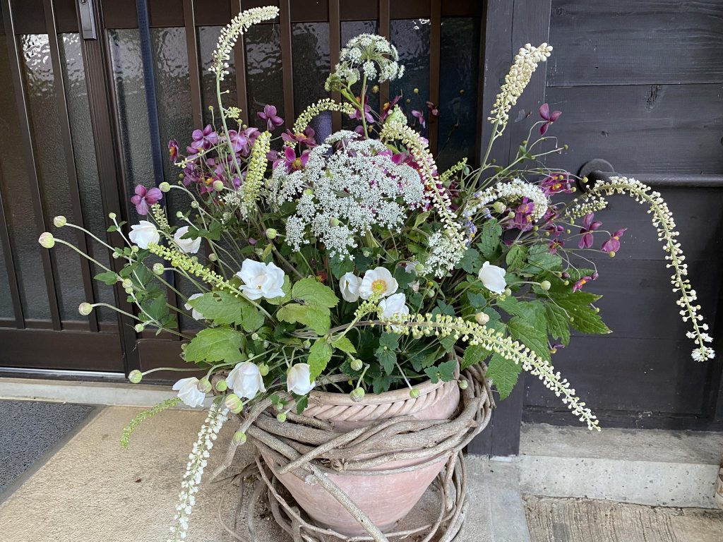 大島区ではいつもの家でシラネセンキュウ、サラシナショウマなどが入った生け花写真を撮らせてもらいました。この季節の最高にきれいな花をまとめて見た感じです。下の画像はその生け花と吉川区で今年初めて見たシロバナサクラタデの花です。