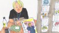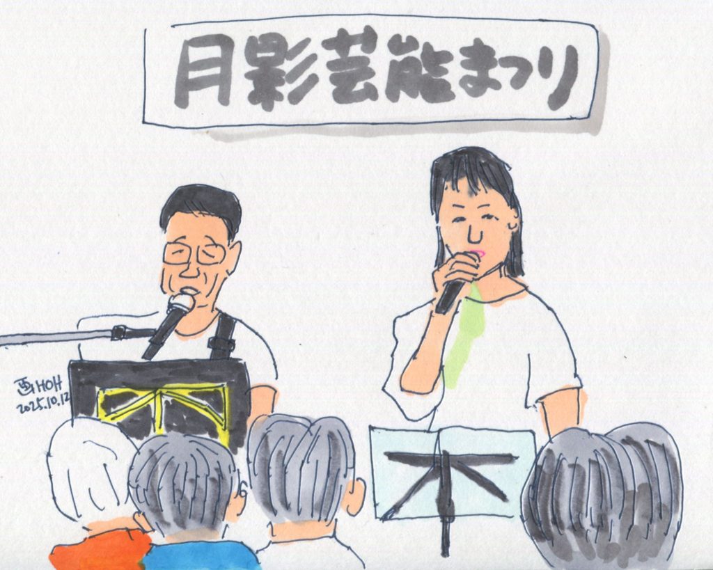 昨日は大忙しでした。午前は18回目の月影芸能祭でした。芸能祭のポスターに私のイラストを採用してもらっている関係もあって、私も来賓の一人として挨拶させていただきました。トップは地元の伝統芸能として雅楽を守り続けている皆さんの演奏でした。これまでに聞いたことのない楽器も新たに加わっての演奏でした。地元、浦川原区の音楽グループの歌も素敵でした。私は歌謡部門の一番最初に、「上を向いて歩こう」を歌いました。なんとかつっかえないで歌うことができました。会場は地元や近隣の住民、福祉施設入所者のみなさんなどでいっぱいでした。多くの方から、「いつも読んでますよ」「市議補選、がんばってね」などと声をかけていただきました。下のイラストは福井さんなど地元の音楽グループの演奏風景を描きました。