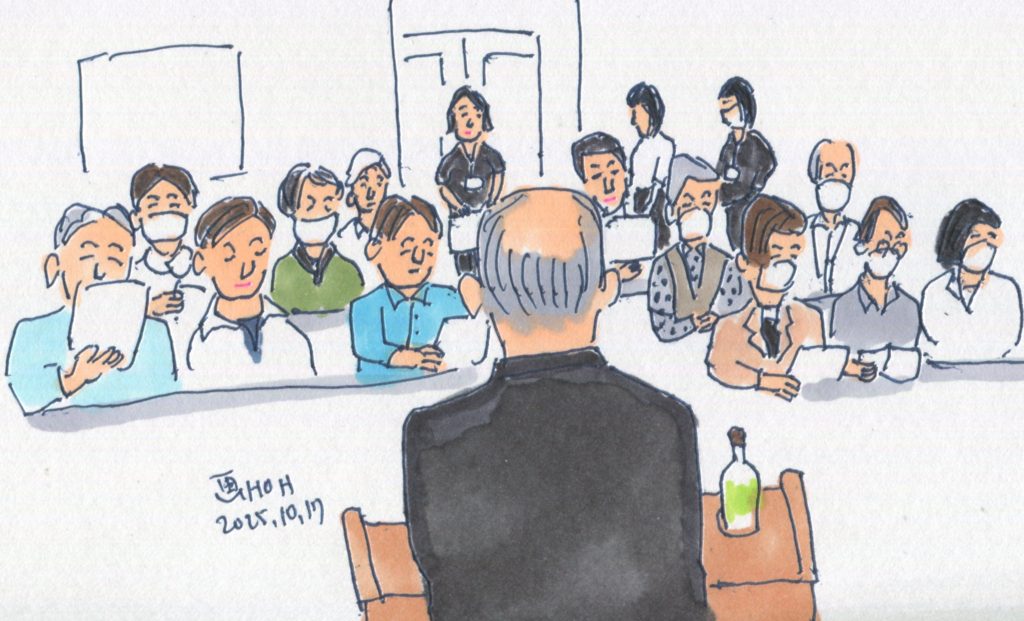 昨日は午前9時半から頸城希望館にて頸北カレッジでした。そこでコウノトリの講演を頼まれていて、約40分、コウノトリはどんな鳥か、いまどうしているか、コウノトリから学んだことなどを話させてもらいました。約40人の方々が真剣に聴いてくださいました。聴衆のほとんどは女性でした。緊張しましたね。トップおよび下のイラストはその時の様子です。