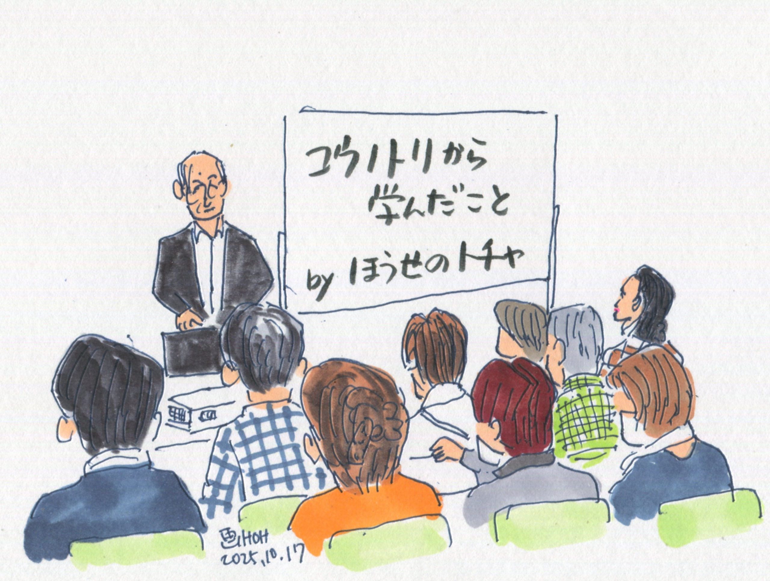昨日は午前9時半から頸城希望館にて頸北カレッジでした。そこでコウノトリの講演を頼まれていて、約40分、コウノトリはどんな鳥か、いまどうしているか、コウノトリから学んだことなどを話させてもらいました。約40人の方々が真剣に聴いてくださいました。聴衆のほとんどは女性でした。緊張しましたね。トップおよび下のイラストはその時の様子です。