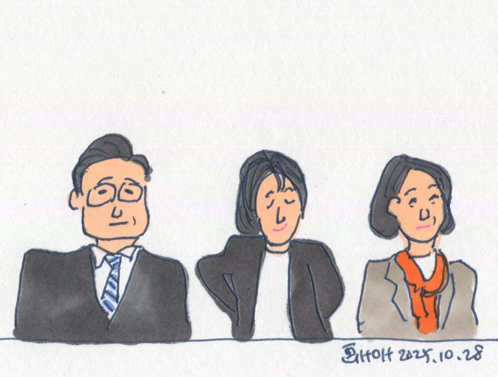 午後からは月例議員懇談会でした。この会議の冒頭、今回の補選で当選した宮川、中土井、渡辺の3議員が、「戻ってきました」「これからもよろしくお願いします」などと元気に挨拶しました。それぞれ、うれしそうでしたね。下のイラストは挨拶後の3議員の様子です。宮川、中土井両議員については久しぶりに描きました。