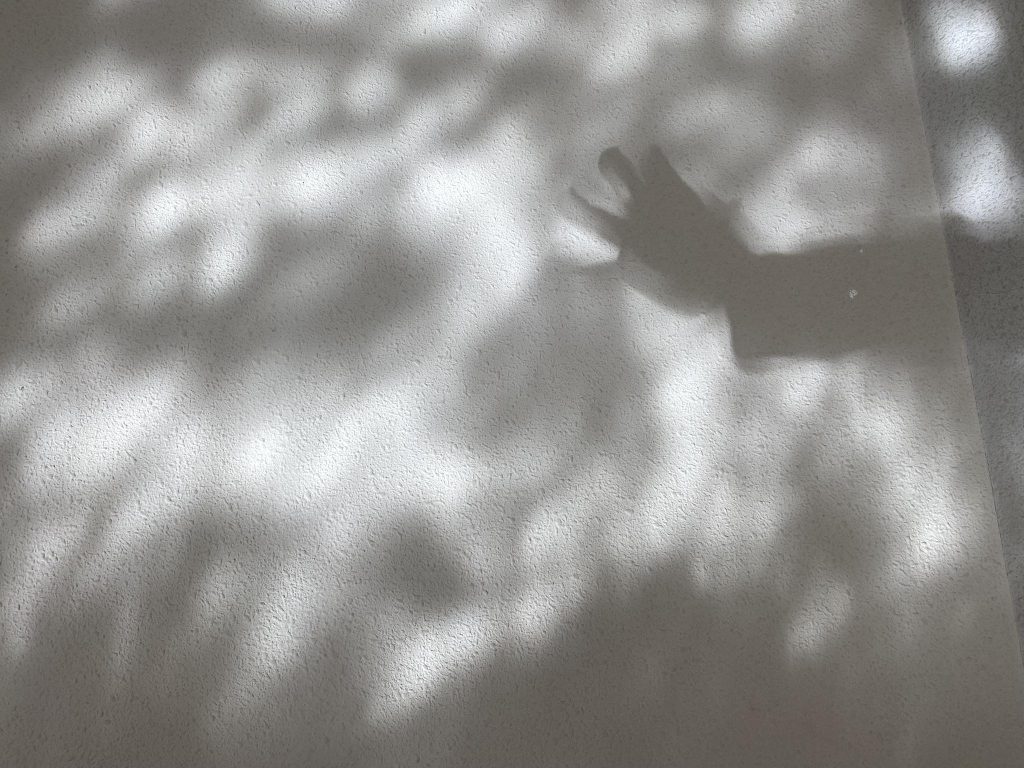 昨日は市役所にいる時間帯が長かったのですが、時々、陽が差して、温めてくれました。下の写真は市役所5階の廊下を歩いていた時に、壁に何かの影が映ったのでいたずらしてみました。