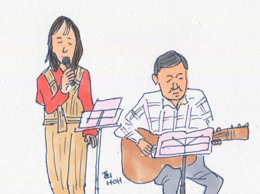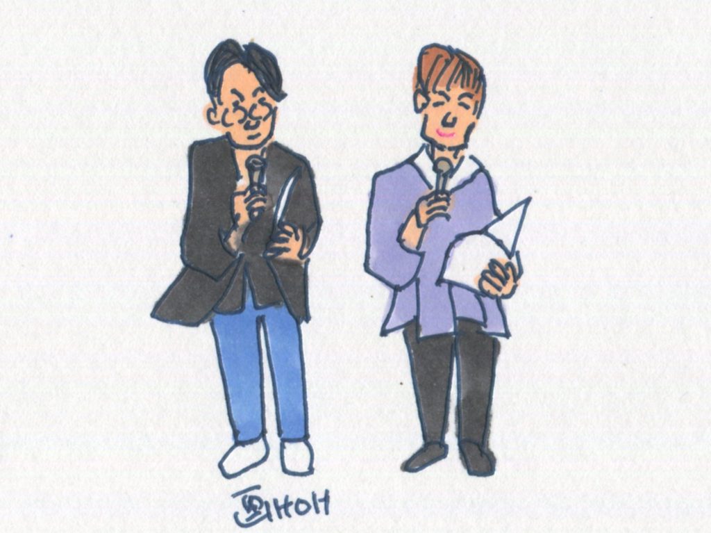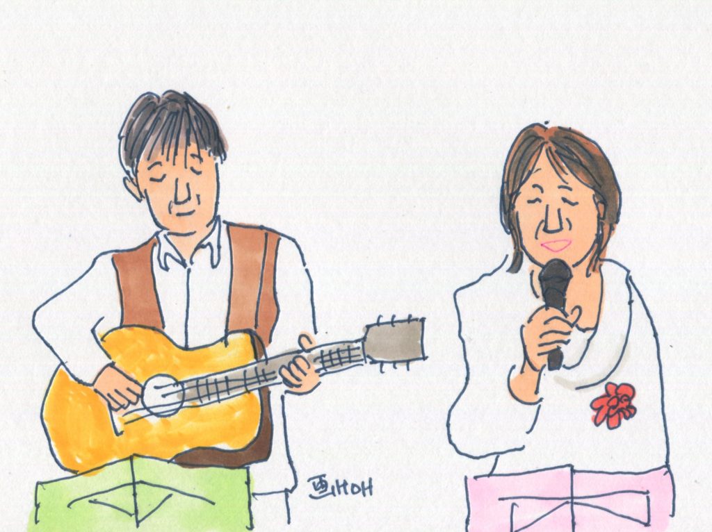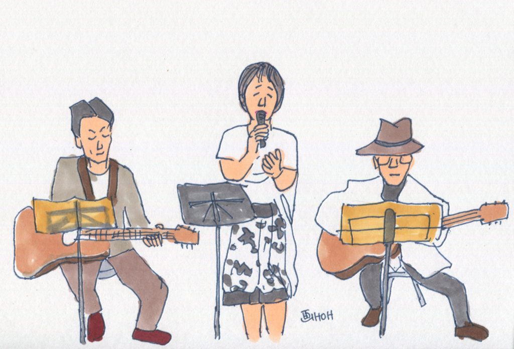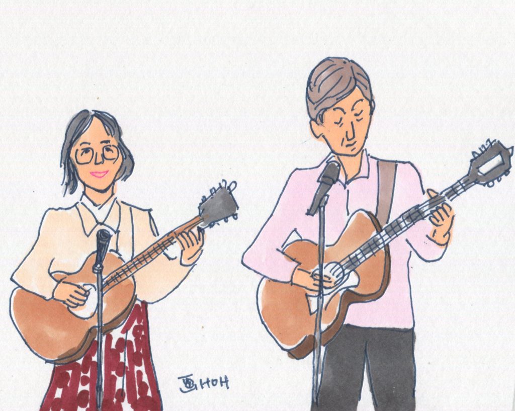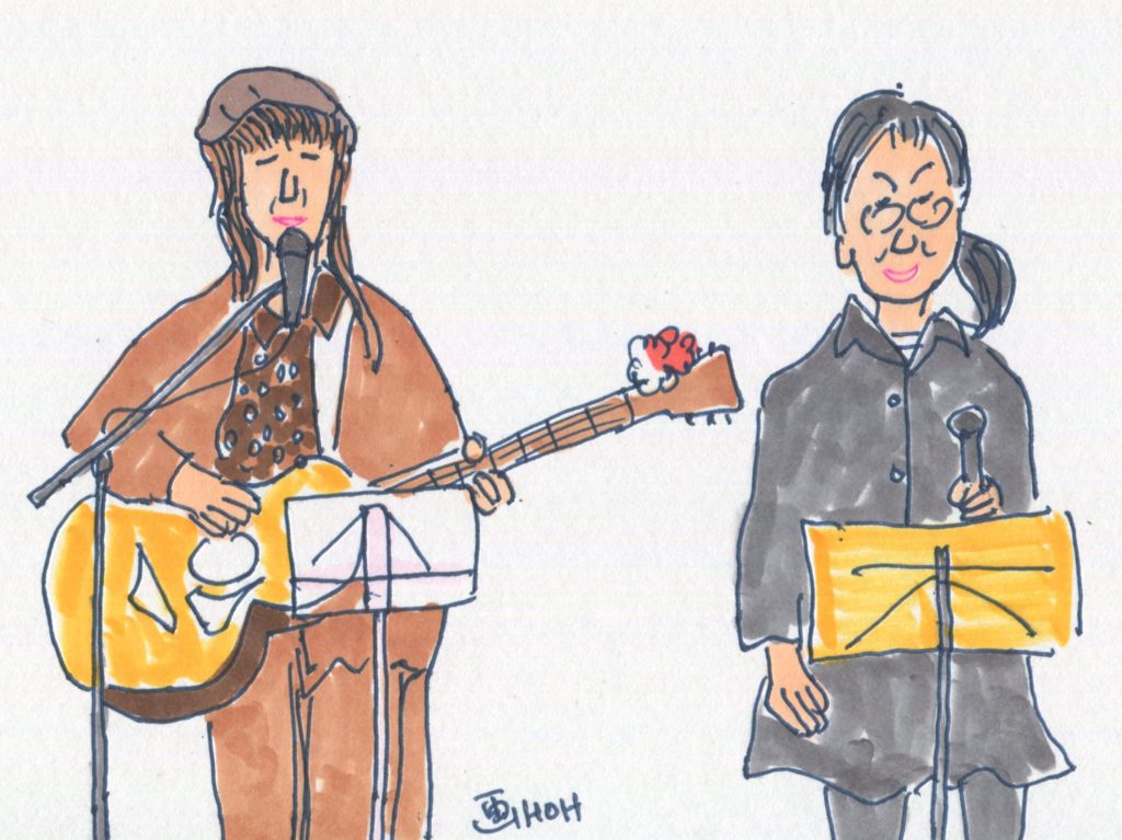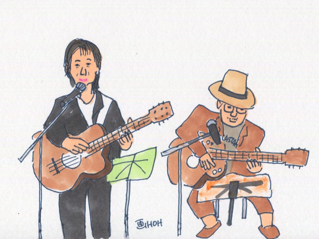 今回、参加することになっていたユニットは14でしたが、「くろみつ」さんが体調不良で急遽不参加となって13ユニットとなりました。参加したユニットは「水仙」「Windosong」「ヒデ」「W.U」「ナカヤシキ」「ヨーコ&ケイ」「吟遊詩人」「FAS」「Sep」「二中フレンズ(オジマキVersion)」「クレア」「スワANI」「あんず」です。出演順に演奏風景のイラストをアップします。最後のイラストは司会のお二人です。