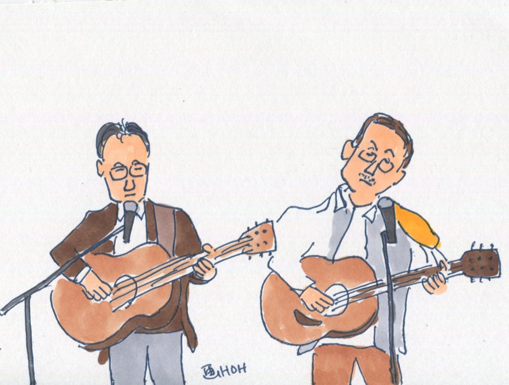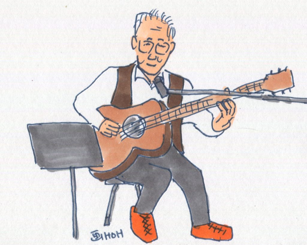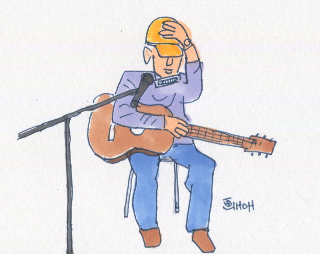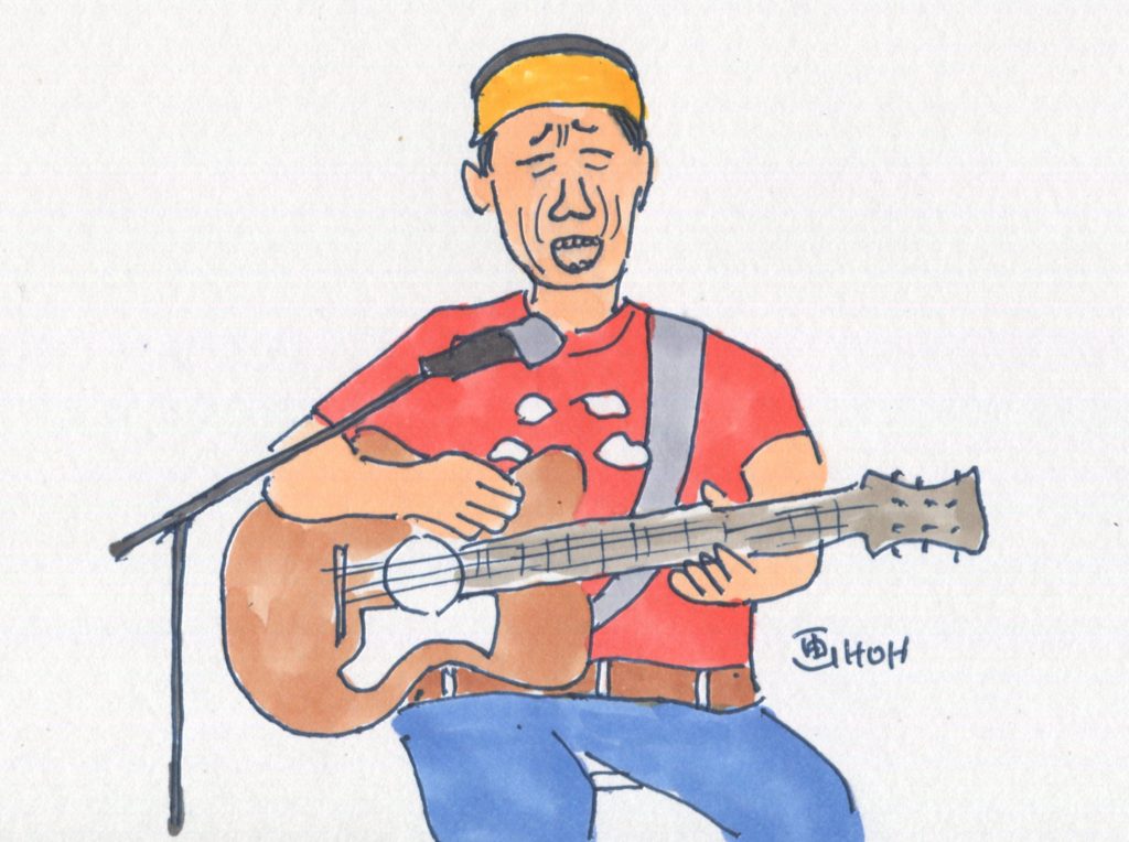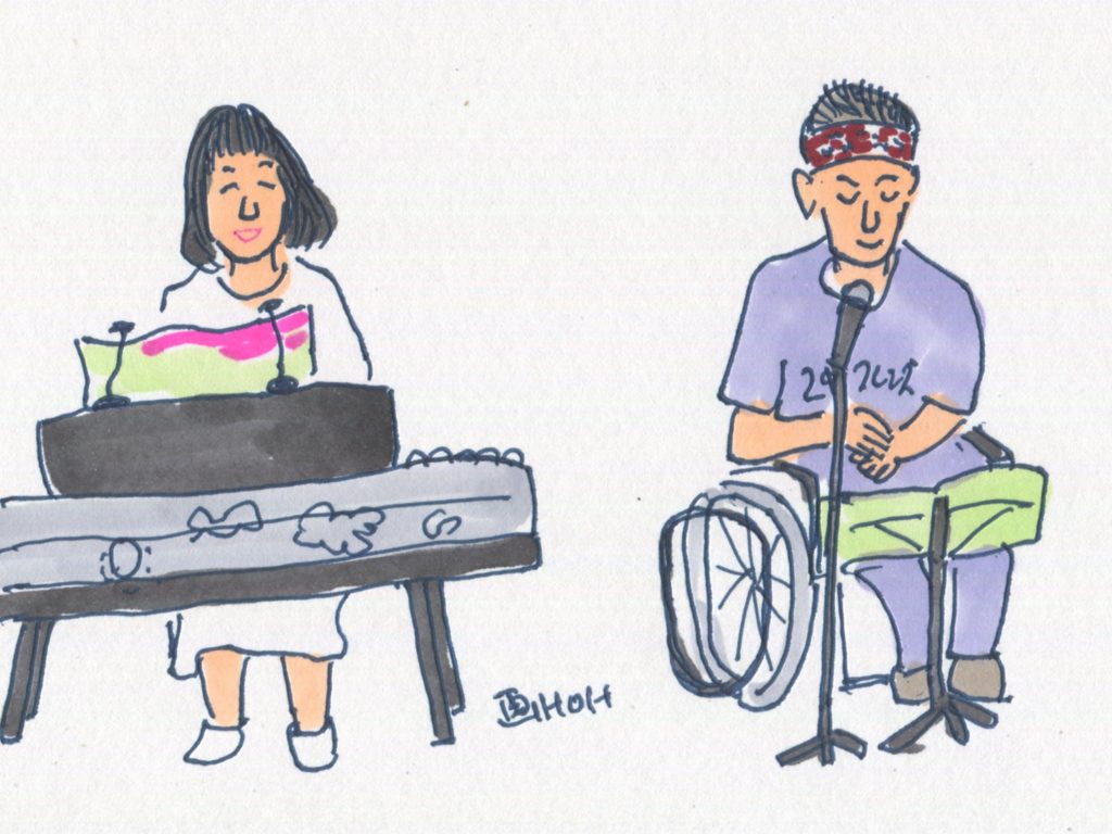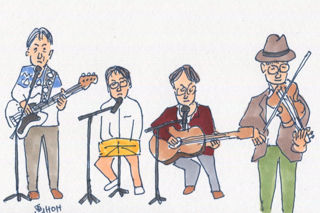今回、参加することになっていたユニットは14でしたが、「くろみつ」さんが体調不良で急遽不参加となって13ユニットとなりました。参加したユニットは「水仙」「Windosong」「ヒデ」「W.U」「ナカヤシキ」「ヨーコ&ケイ」「吟遊詩人」「FAS」「Sep」「二中フレンズ(オジマキVersion)」「クレア」「スワANI」「あんず」です。出演順に演奏風景のイラストをアップします。最後のイラストは司会のお二人です。