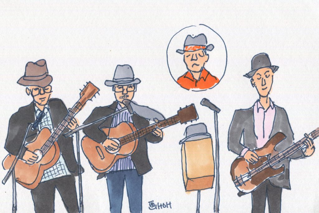「あの頃青春コンサート」は第19回目です。今回もドラマに満ちたコンサートとなりました。3年前に病気で倒れ、半身不随となったスワOJIさんが先日の「サンデーフォーク」に続いて「青春コンサート」にも復帰したのです。そして弟の復帰を祝うかのように、バカでかい声でスワANIが山崎ハコの「気分を変えて」「向かい風」の2曲を見事に歌いあげました。もう最高の盛り上がりでした。そして5月に1人の仲間、Yさんを亡くした吟遊詩人は、Yさんの担当であったカフォンと彼の帽子を舞台で飾り、かぐや姫の「けれど生きている」などを熱唱しました。涙なしには聴けませんでした。この感動を失わないうちにと、13のすべてのユニットと司会のイラストを午前3時までかけて描き上げました。