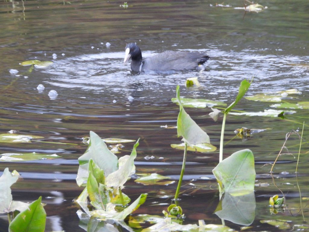 配達の途中、小苗代池に寄りました。先日、何の鳥か分からなかった黒い鳥はオオバンであることがわかりました。先日は後ろ姿だけでしたが、今朝は道路に近いところを泳いでいて、クチバシの色が白いことをはっきりと確認できました。トップ画像および下の画像をご覧ください。