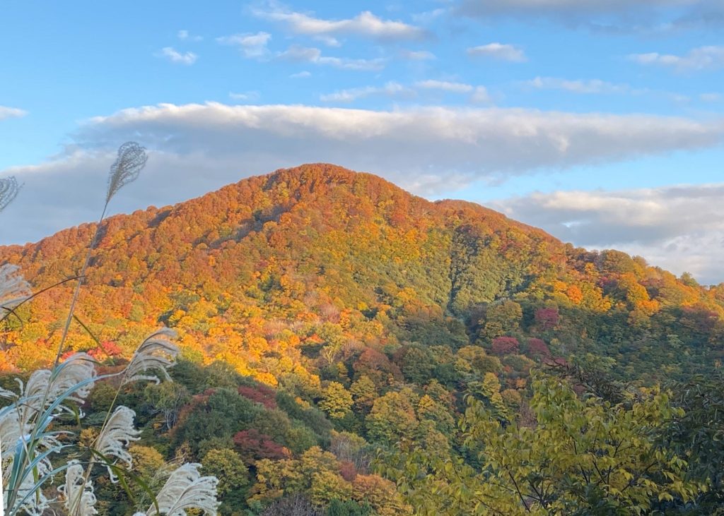 その後、上川谷から尾神岳を通るルートで帰宅しました。途中で見た紅葉風景が見事でした。下の画像は尾神岳側からみた兜巾山の紅葉です。陽が当たったところはあざやかです。日陰になったところは尾神岳の影です。