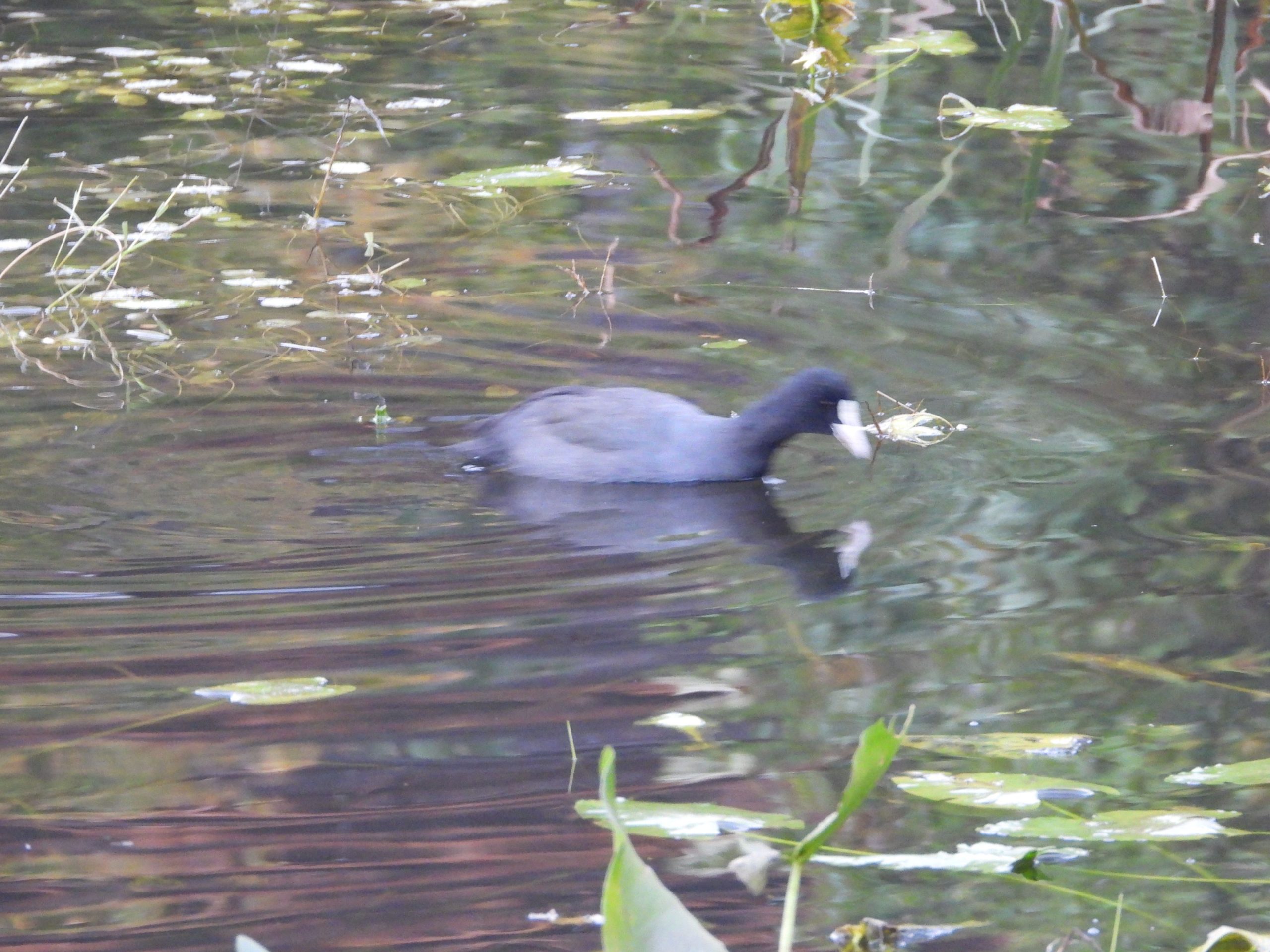 配達の途中、小苗代池に寄りました。先日、何の鳥か分からなかった黒い鳥はオオバンであることがわかりました。先日は後ろ姿だけでしたが、今朝は道路に近いところを泳いでいて、クチバシの色が白いことをはっきりと確認できました。トップ画像および下の画像をご覧ください。