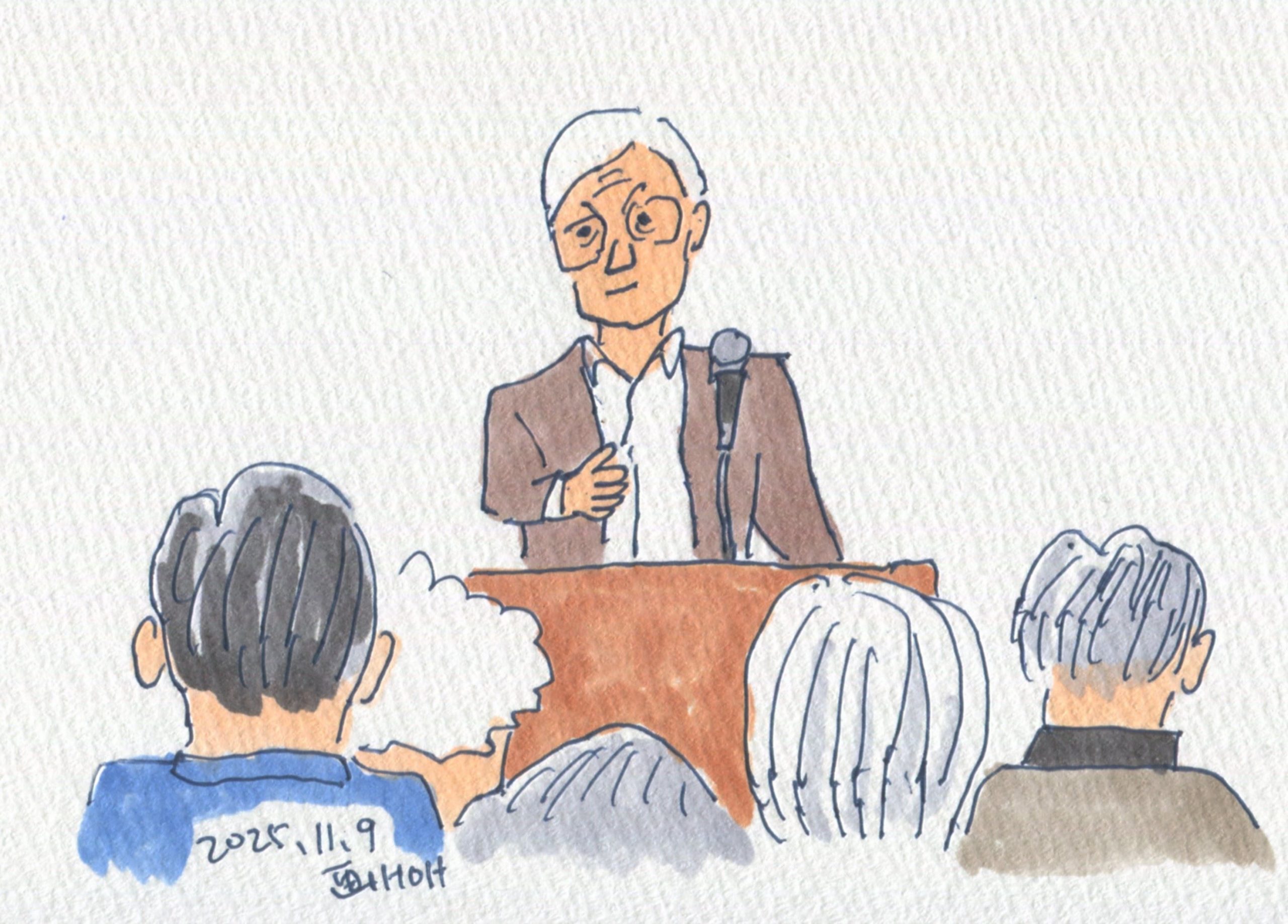午後からは治安維持法国家賠償要求同盟上越支部主催の講演会でした。講師は小樽商科大学名誉教授の萩野富士夫さんです。「小林多喜二と治安維持法」というタイトルで1時間半、講演されました。タモリが3年前、「新たな戦前」という言葉を使って以来、いまの政治状況を「新しい戦前」と呼ぶことは定着していますが、萩野さんは、石破政権時の経済安全保障推進法の動きなどを例に現在は、「新たな戦中」前夜になってきたと指摘しました。その上で、治安維持法がいかにして小林多喜二を襲ったかなどを多喜二の日記や多喜二の小説などを駆使して解明しました。子ども向けに文章を書いていたことなど初めて知ることがいくつもありました。いい講演だったと思います。講演の様子はトップのイラストをご覧ください。