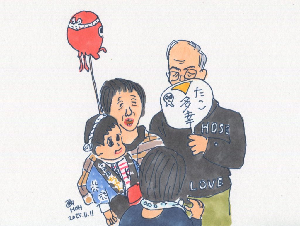 夜は党務で原稿書きに精を出しました。途中、息抜きに先日のお楽しみ会での一こまをイラストに描きました。そこでは、腹話術をやっているMさんから「手伝って」と言われ、団扇(うちわ)とタコを預けられましたが、その際、調子に乗って、団扇を使って口を隠し、高音でしゃべったら、コンビで腹話術をやっているような雰囲気をつくりだすことに成功しました。下がその場面を描いたイラストです。団扇を使った芸は急に思いついて実行したものですが、何か新たな分野を拓いた気がして、その芸を「うちわ術」と名付けました(笑)。いつかもう一度挑戦してみようと思います。
