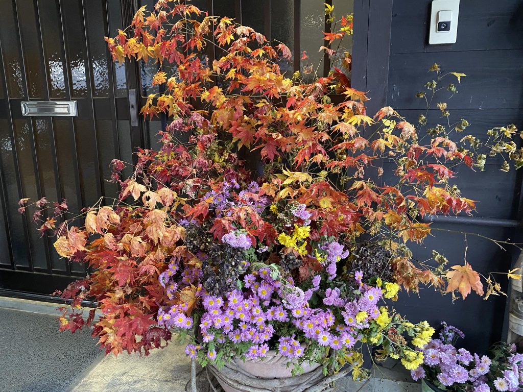大島区ではいつもの家の玄関へ行き、驚きました。花を玄関に飾るのは今シーズンは終わりですと先々週、言われていましたが、パッと明るくなっていたのです。そこにはキクとともに紅葉したモミジが飾られていて、花と同じ役割を果たしていました。考えましたね。