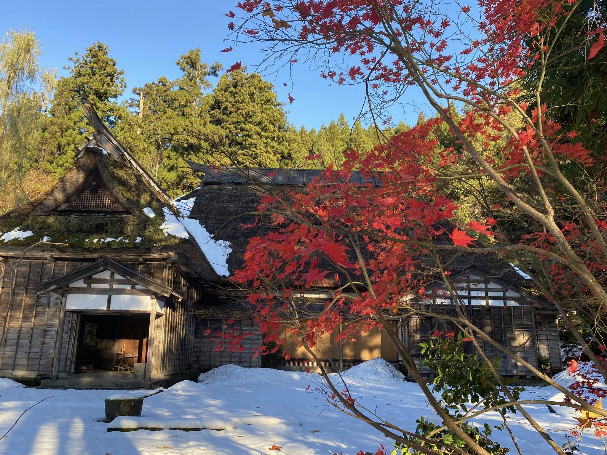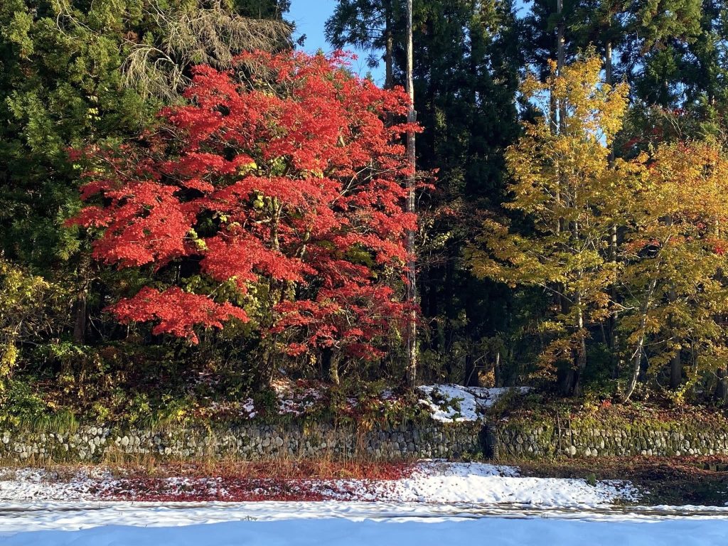 午後からは車中でおにぎりを食べ、三和、大島方面へと車を進めました。びっくりしたのは浦川原区の虫川あたりから除雪車で国道が除雪してあったことです。もちろん、一昨日の仕事ですが、けっこう降ったのですね。大島区で聞いたら、田麦で35㌢くらい積もったとのことでした。雪が降ったことで紅葉しているところはめったに見られない景色が出現しました。トップ画像が大島区の飯田邸です。飯田邸の少し手前も赤く染まっていました。いずれも最高にきれいでした。