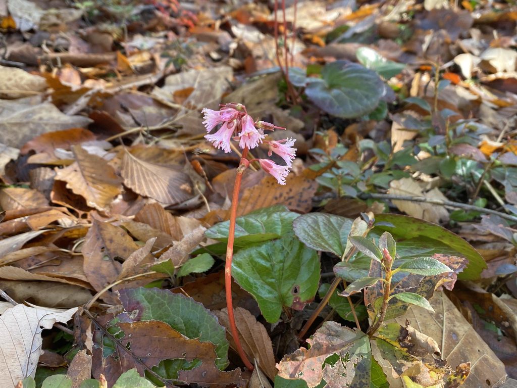 その後、いったん地元に戻り、地元の人などとともに町田の山に入りました。私としては、議会の一般質問で取り上げた古墳群がどういう状況になっているかをより深く、広く知りたいと思っていました。前日の天気と違い、よく晴れていましたので、林の中は太陽の光がさしていて快適でした。議会の質問では、丸山古墳との関係などについても触れたのですが、昨日の踏査のなかで朝日池や鵜池などが見えるところもしっかり確認できました。頸城三山も見えました。風光明媚なところ、自分の生活していたところが見える場所にお墓をつくりたいという気持ちがよくわかります。これまで私は、1~5号墳までしか見ていなかったのですが、昨日は9号墳まで歩きました。紅白のポールを杖がわりに使いましたが、いいもんですね。町田古墳群は思っていた以上に広いことを知りました。早く全体像が解明されるとうれしいです。昨日は数年前とほぼ同じ場所で、イワカガミがピンクの花を咲かせているのを見つけました。通常は4月下旬から5月上旬に咲く花です。前回は草刈り機などで一度刈られたことによる秋の開花と判断したのですが、どうもそれだけではないようです。知りたくなる自然界の不思議な出来事がまた1つ増えました。下は昨日見たイワカガミです。